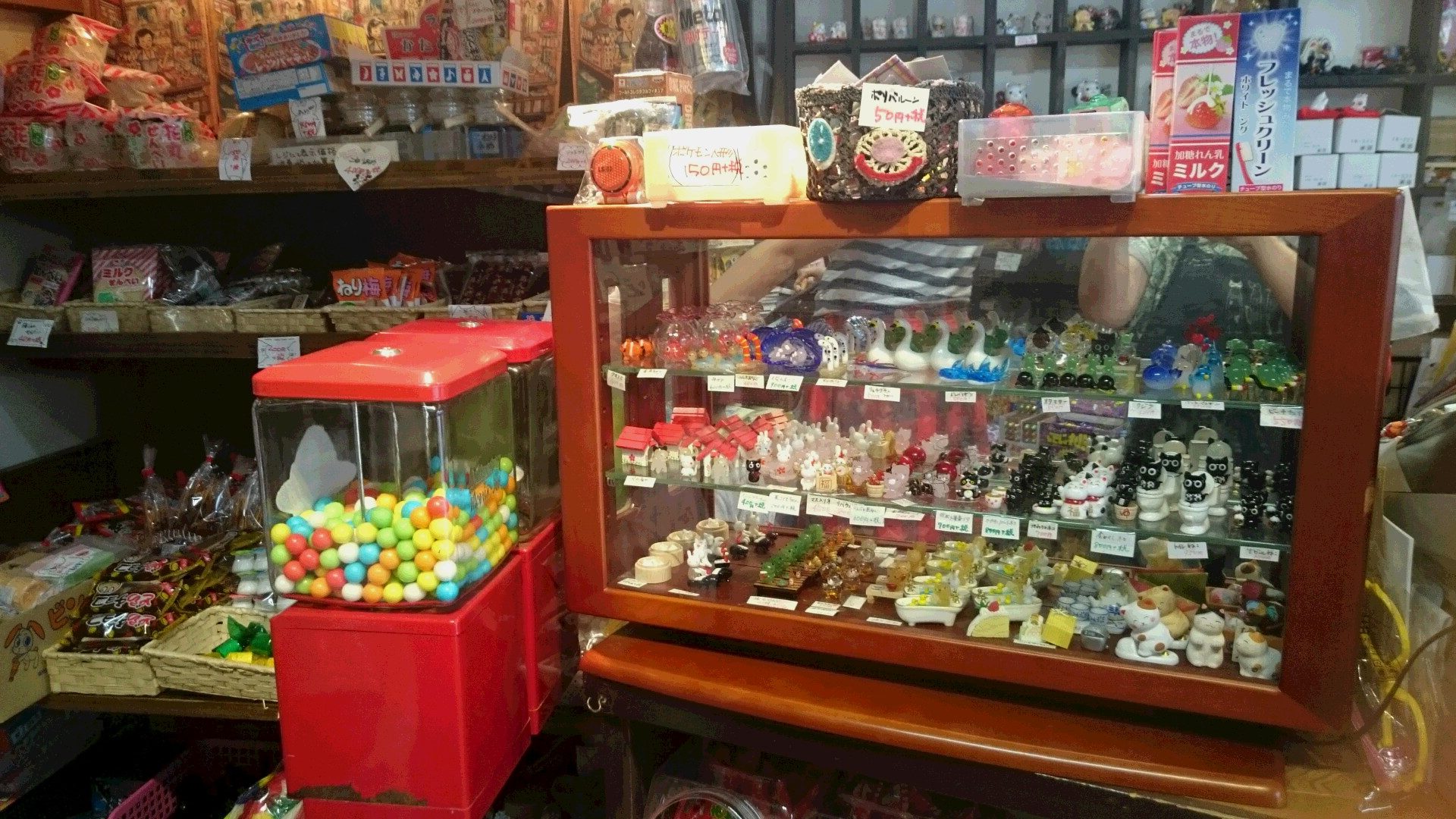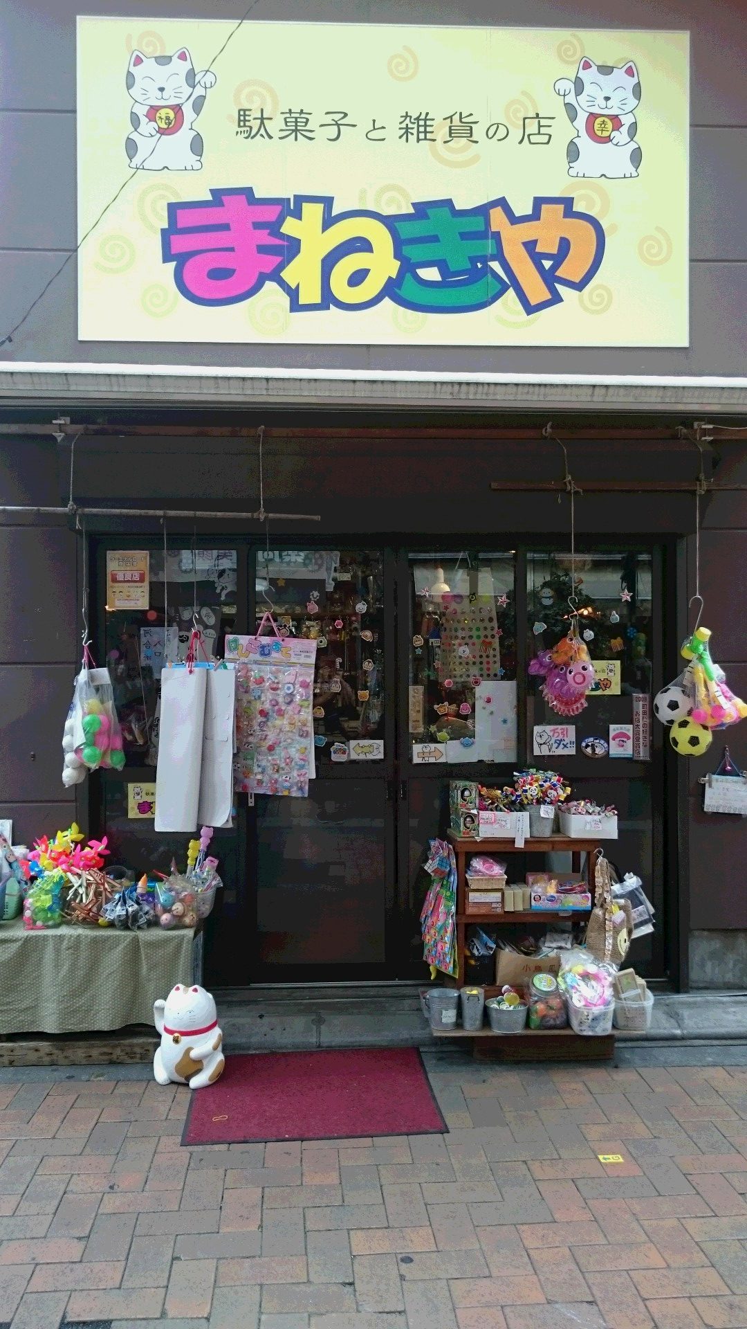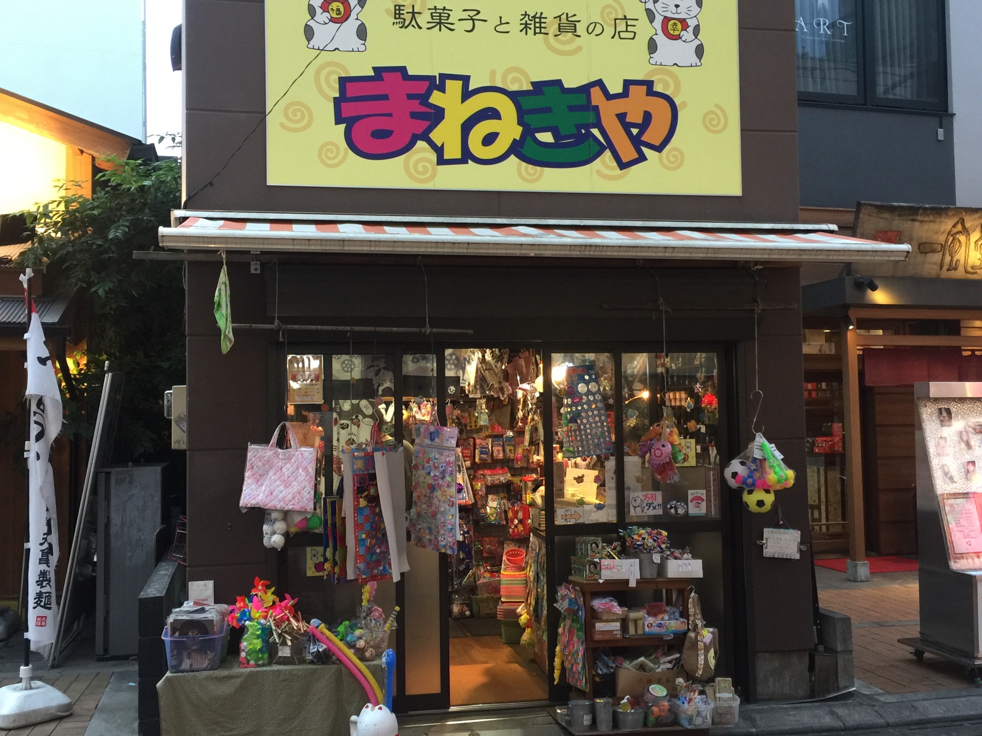 - 昔懐かしい駄菓子と現代のお菓子、まねき猫やおはじき、メンコ、羽子板にコマなどの季節のおもちゃ、キャラクター文具など、懐かしい物と今流行りの物と取り揃えております。海外へのお土産にも重宝していただいております。
