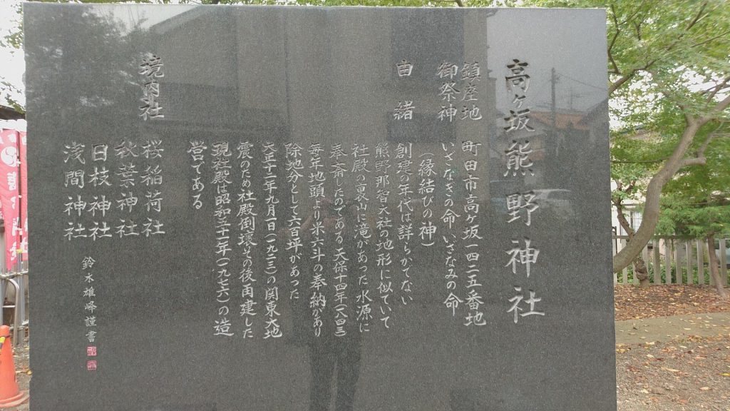 GUIDE 観光ガイド 町田市内には「熊野神社」は6社務所あるようです。高ヶ坂地区では地元の氏神様「高ヶ坂熊野神社」です。昔は平安時代、熊野那智大社の地形と似ていることから、この地に奉祭されたと伝えられています。